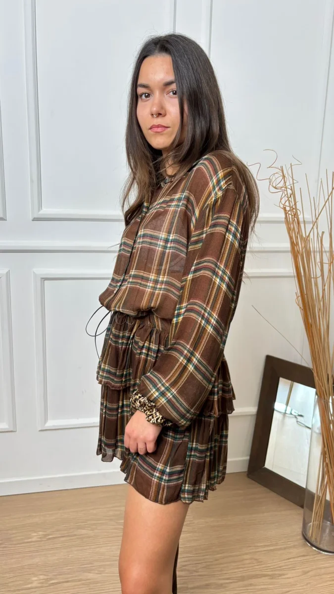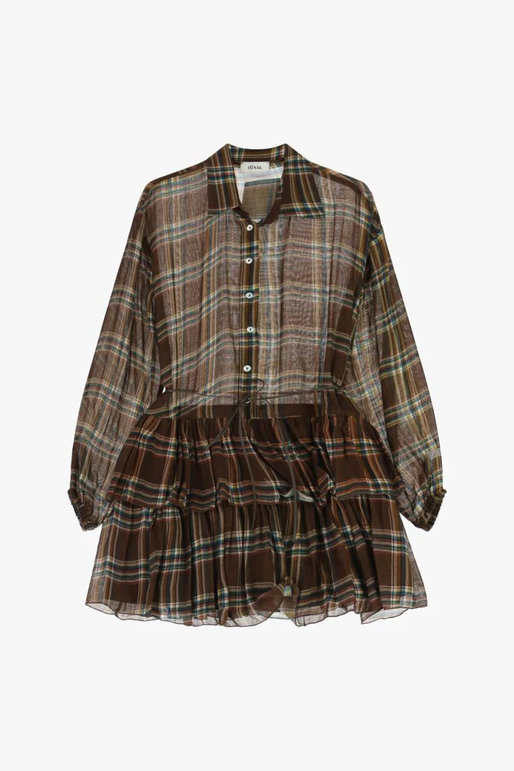 Abito a quadri con balze Dixie A067Y045 con colletto classico, abbottonatura sul davanti e maniche lunghe.