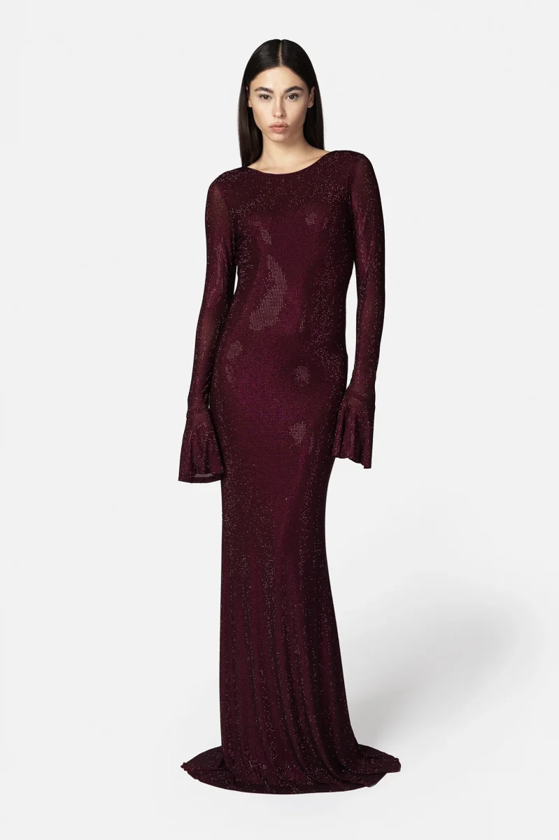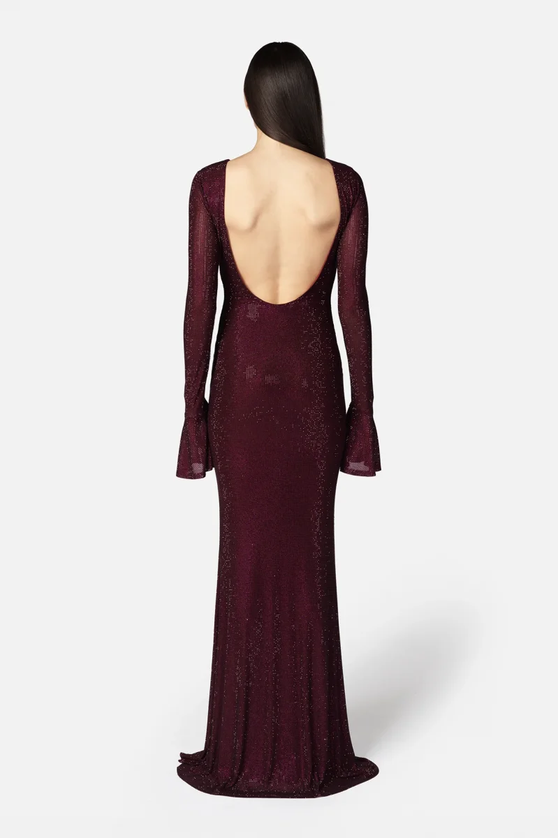 Abito Algedi lungo prugna, linea sirena in tessuto tulle interamente ricoperto di strass, ampio scollo sul dietro e manica lunga svasata.